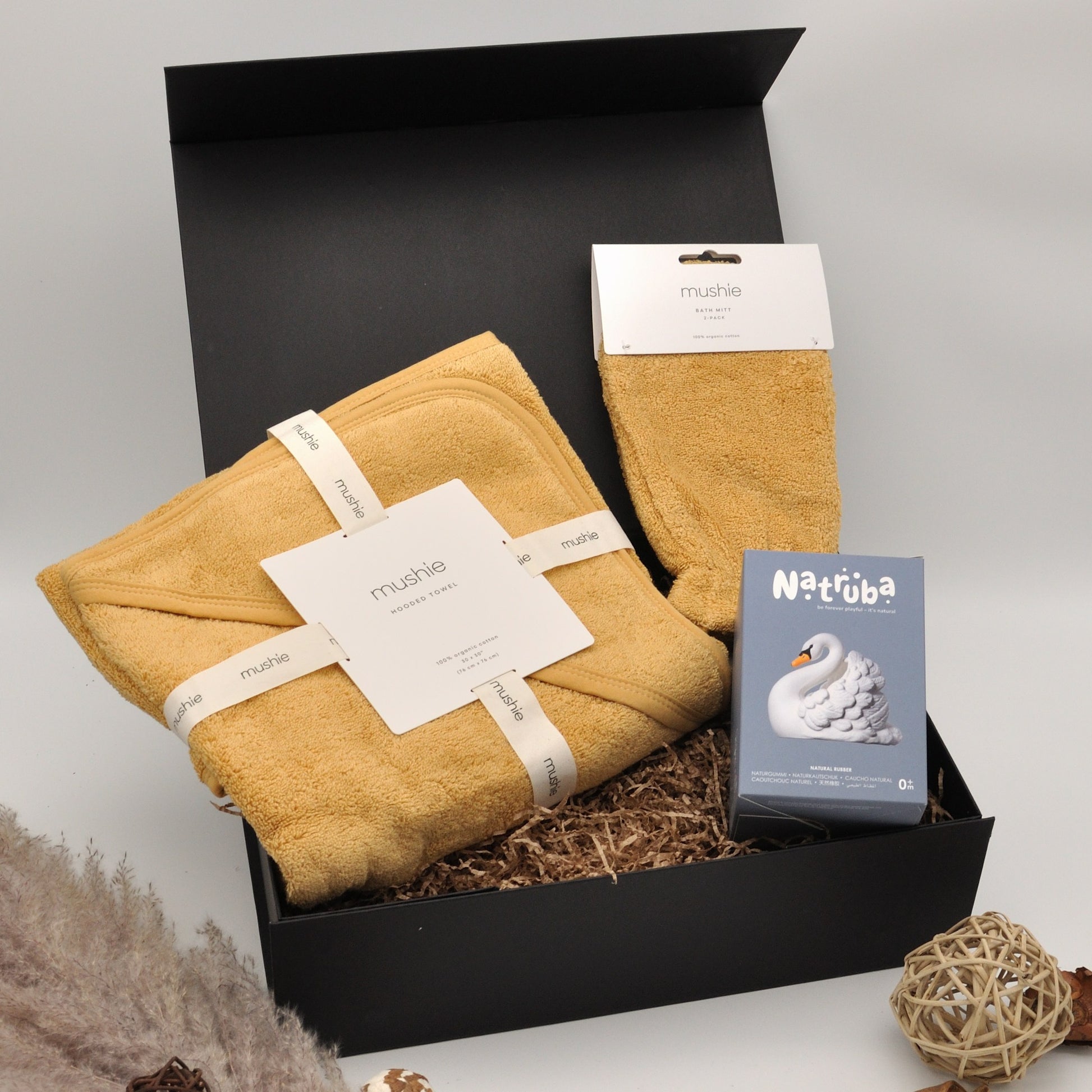 - Hooded towel Mushie: Made of 100% organic cotton, this hooded towel from Mushie is gentle on sensitive skin and perfect for cozy cuddles after the bath. The fabric is absorbent and durable and remains soft wash after wash. Made of 100% organic cotton.