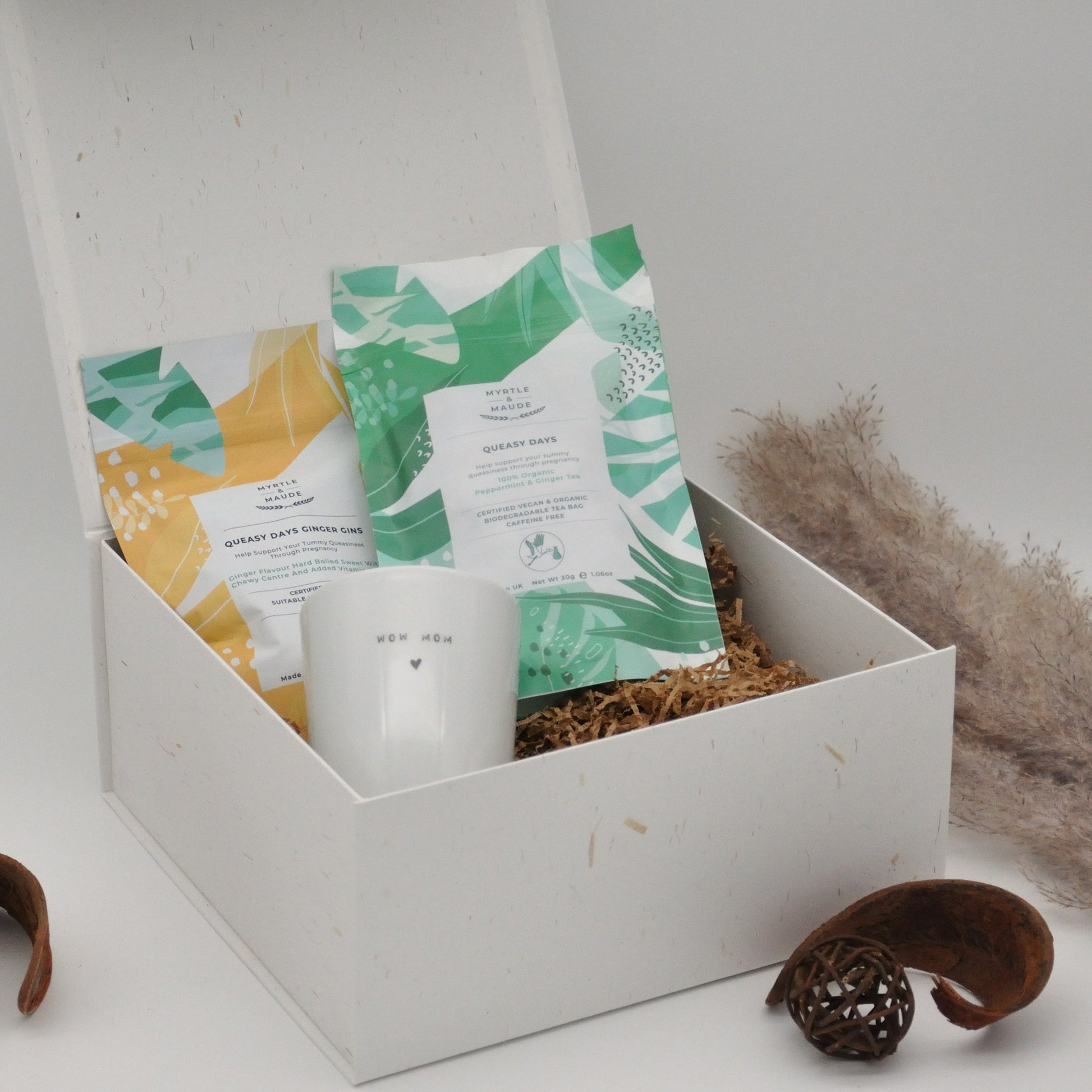 • Myrtle & Maude Morning Sickness Chocolates: Enjoy specially curated chocolates infused with natural peppermint oil and enriched with vitamin B6 for refreshing relief from morning sickness. Perfect for on-the-go or whenever symptoms of nausea arise. Free from artificial colours.
